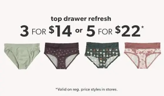 Shop in store and get 3 panties for $14 or 5 for $22.
